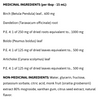 Ingrédients médicinaux (par c. à table - 15 mL): Bouleau (Betula Pendula) feuille...... 600 mgPissenlit (Taraxacum officinale) racine - E.P. 4:1 de 250 mg de racines séchées équivalent à...... 1000 mgBoldo (Peumus boldus) feuille - E.P. 4:1 de 125 mg de feuilles séchées équivalent à...... 500 mgArtichaut (Cynara scolymus) feuille - E.P. 4:1 de 125 mg de feuilles séchées équivalent à...... 500 mg Ingrédients non médicinaux : Eau, glycérine, fructose, sorbate de potassium, acide citrique, fruit du moine (siraitia grosbenorii) extrait 80% mogroside, gomme de xanthane, extrait de pépin d’agrume, saveur naturelle.